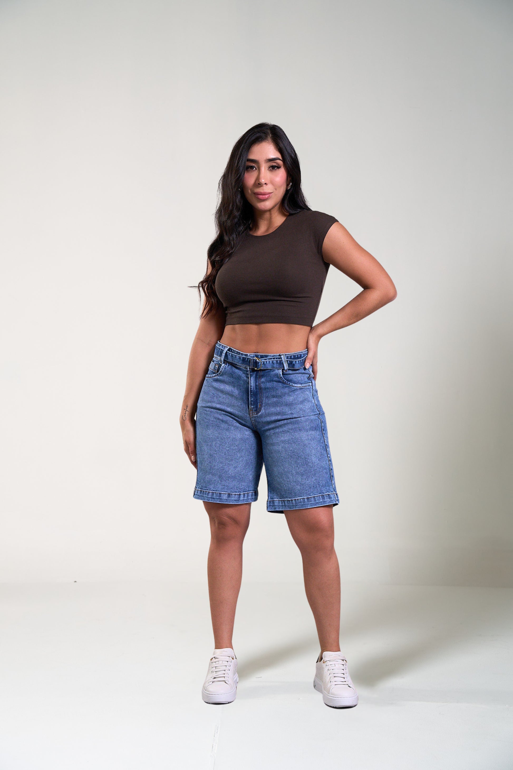 Esta bermuda en denim medio con lavado natural es el equilibrio perfecto entre estilo y comodidad. Con un tiro medio y un ajuste favorecedor, te hará sentir increíble mientras mantienes ese toque moderno. El cinturón le da un toque diferente. Es súper versátil, perfecta para cualquier ocasión.