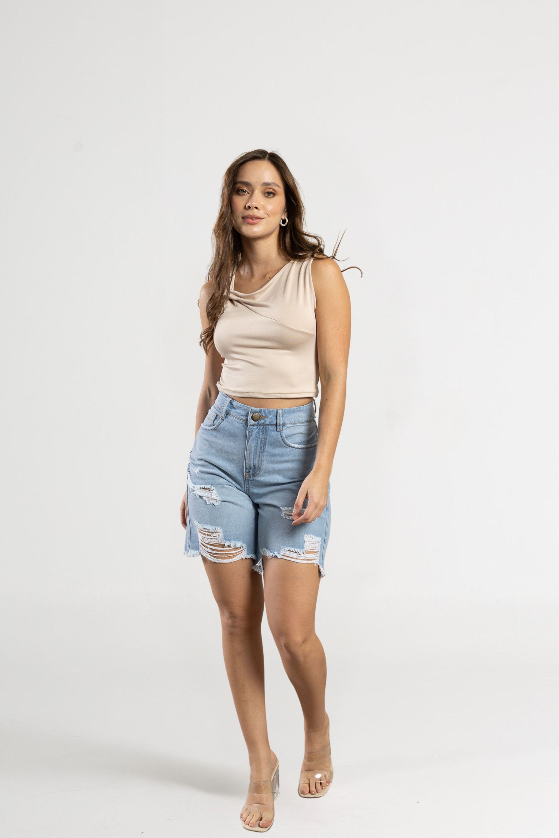 Una prenda que combina diseño y actitud: esta bermuda de tiro alto en denim azul oscuro destaca por sus detalles desgastados, apliques tipo taches y ruedo deshilado. Ideal para darle un toque atrevido y moderno a tus outfits, sin sacrificar la comodidad.