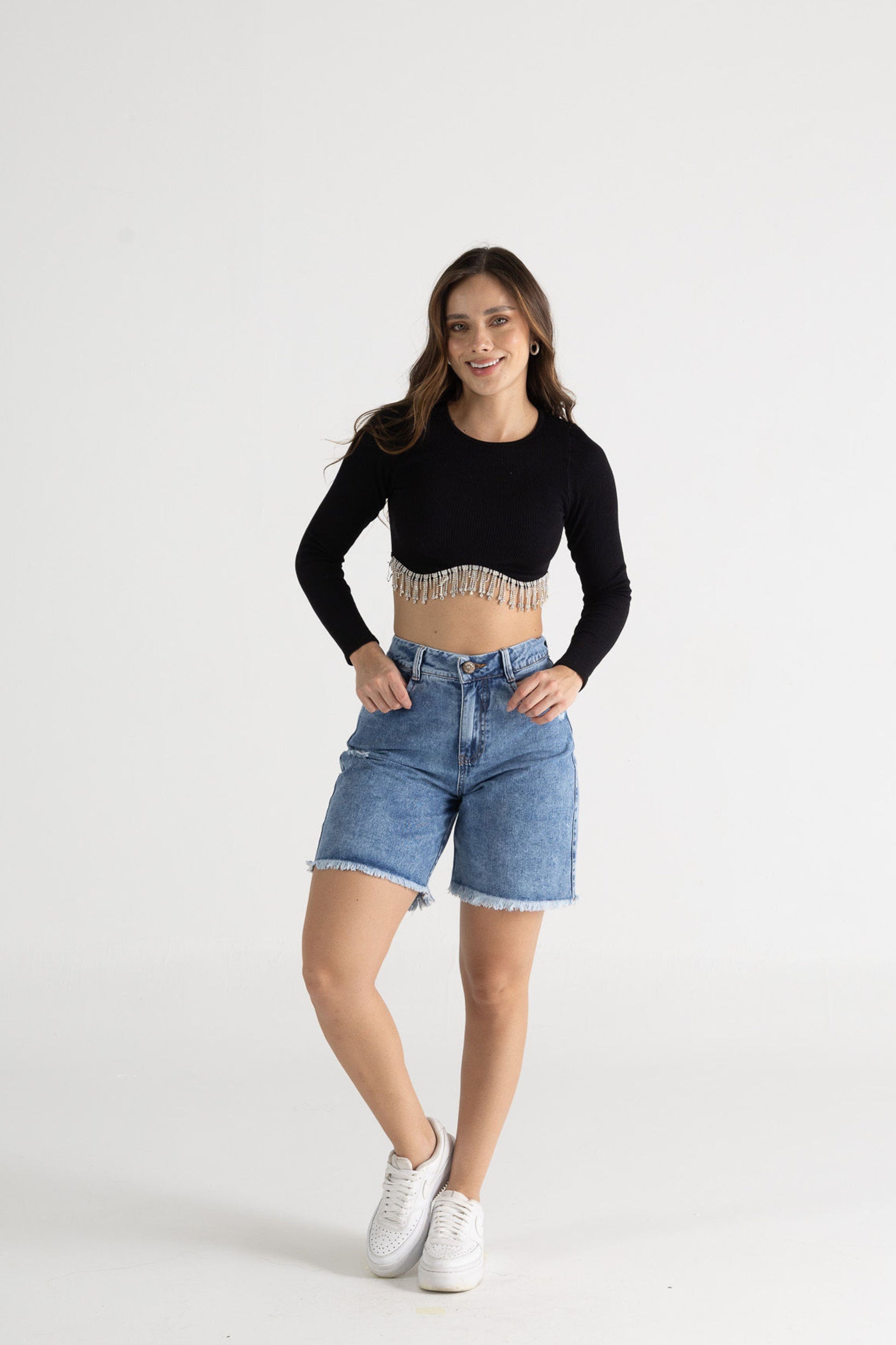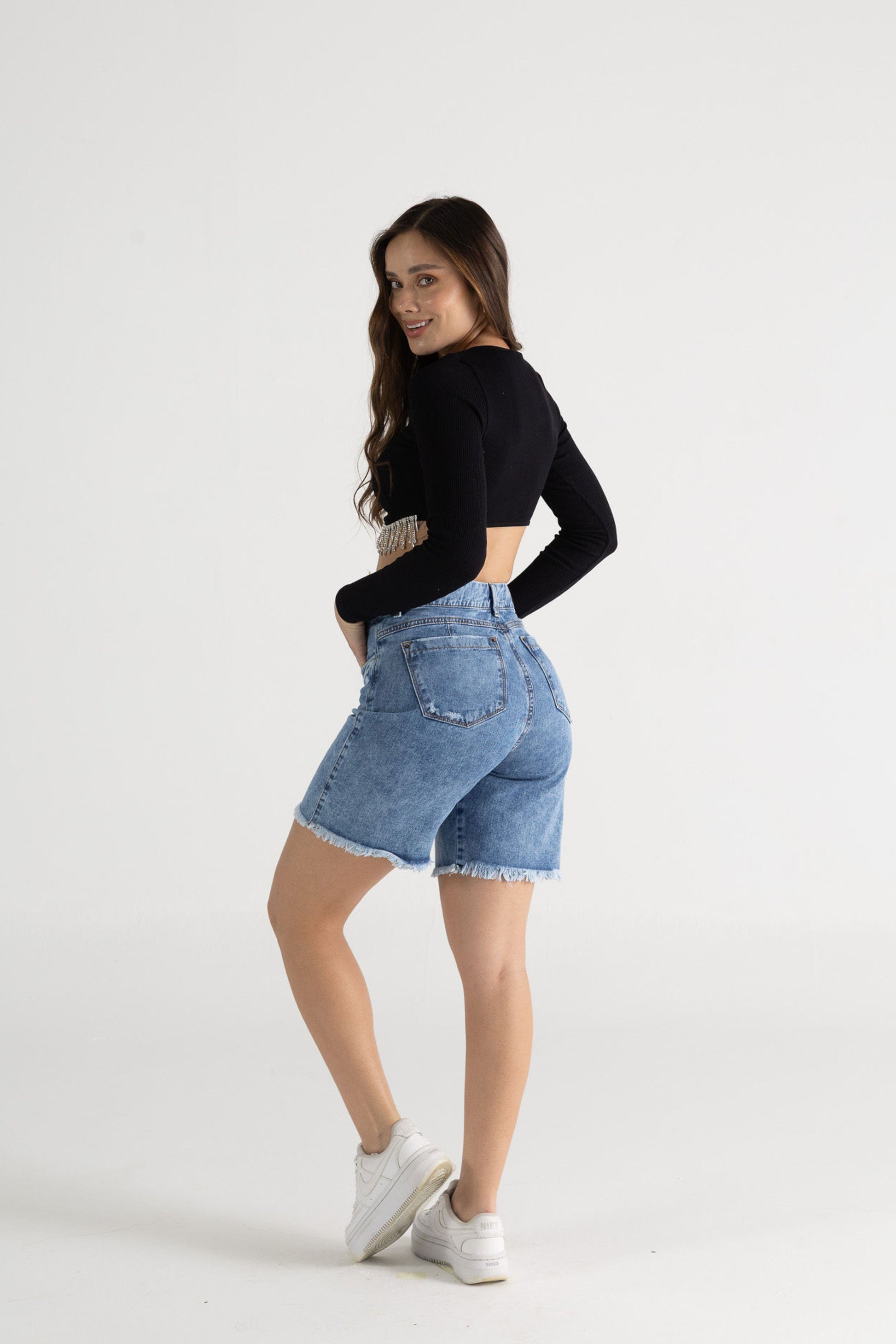 Una prenda que combina diseño y actitud: esta bermuda de tiro alto en azul oscuro destaca por sus detalles desgastados, apliques tipo taches y ruedo deshilado. Ideal para darle un toque atrevido y moderno a tus outfits, sin sacrificar la comodidad.