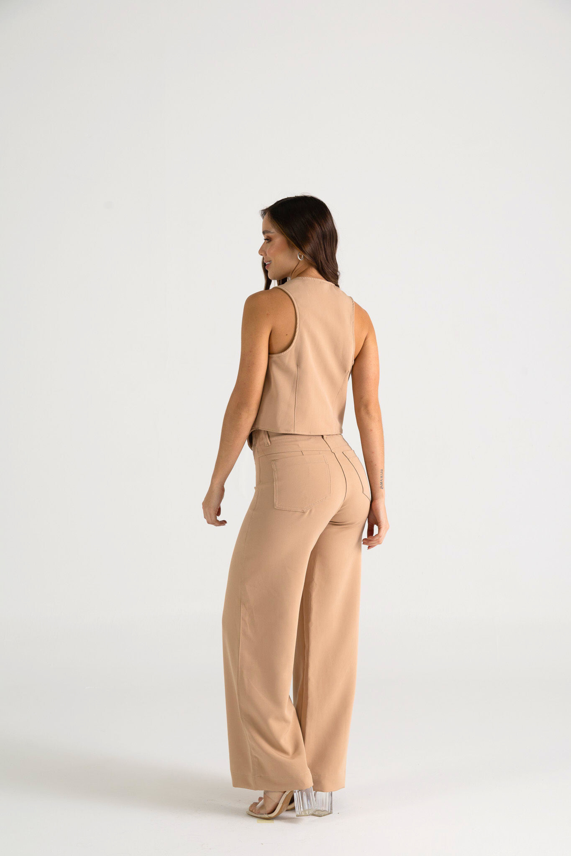 Un look que habla de elegancia y confianza. Este conjunto de chaleco y pantalón clásico y elegante en tonos beige y negro, tiene una caída impecable gracias a su tela rígida, lo que le da una estructura que estiliza la figura y realza la silueta. Es perfecto para usar en la oficina, eventos o días en los que quieres verte bien sin perder comodidad.