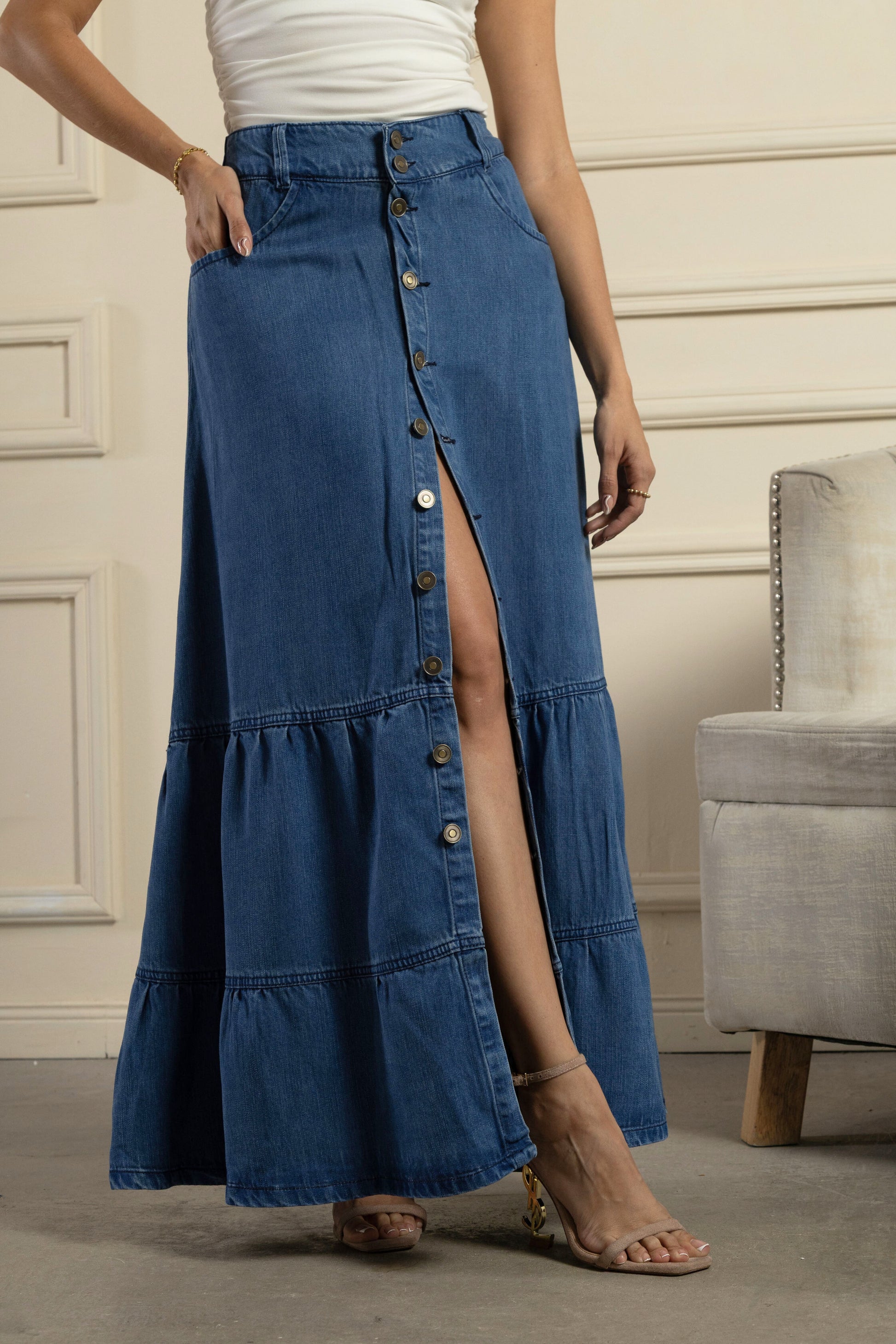 Una prenda que equilibra elegancia y frescura. Su diseño de tiro alto con botones metálicos y una abertura sutil aporta un toque moderno y femenino, ideal para looks casuales o más sofisticados según cómo la combines. El corte fluido estiliza la figura, mientras su tela índigo liviana ofrece comodidad y libertad de movimiento incluso en los días más cálidos. Perfecta para combinar con blusas, tops o bodys ajustados.