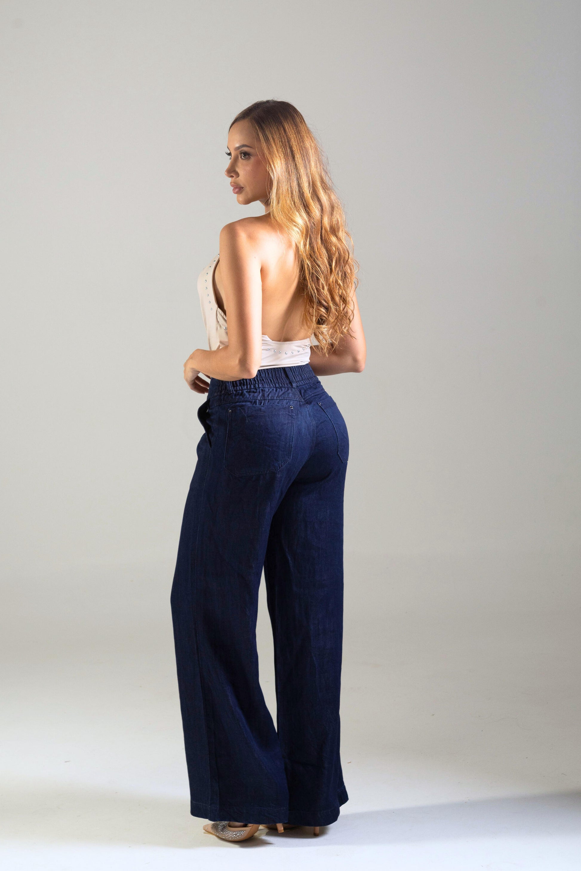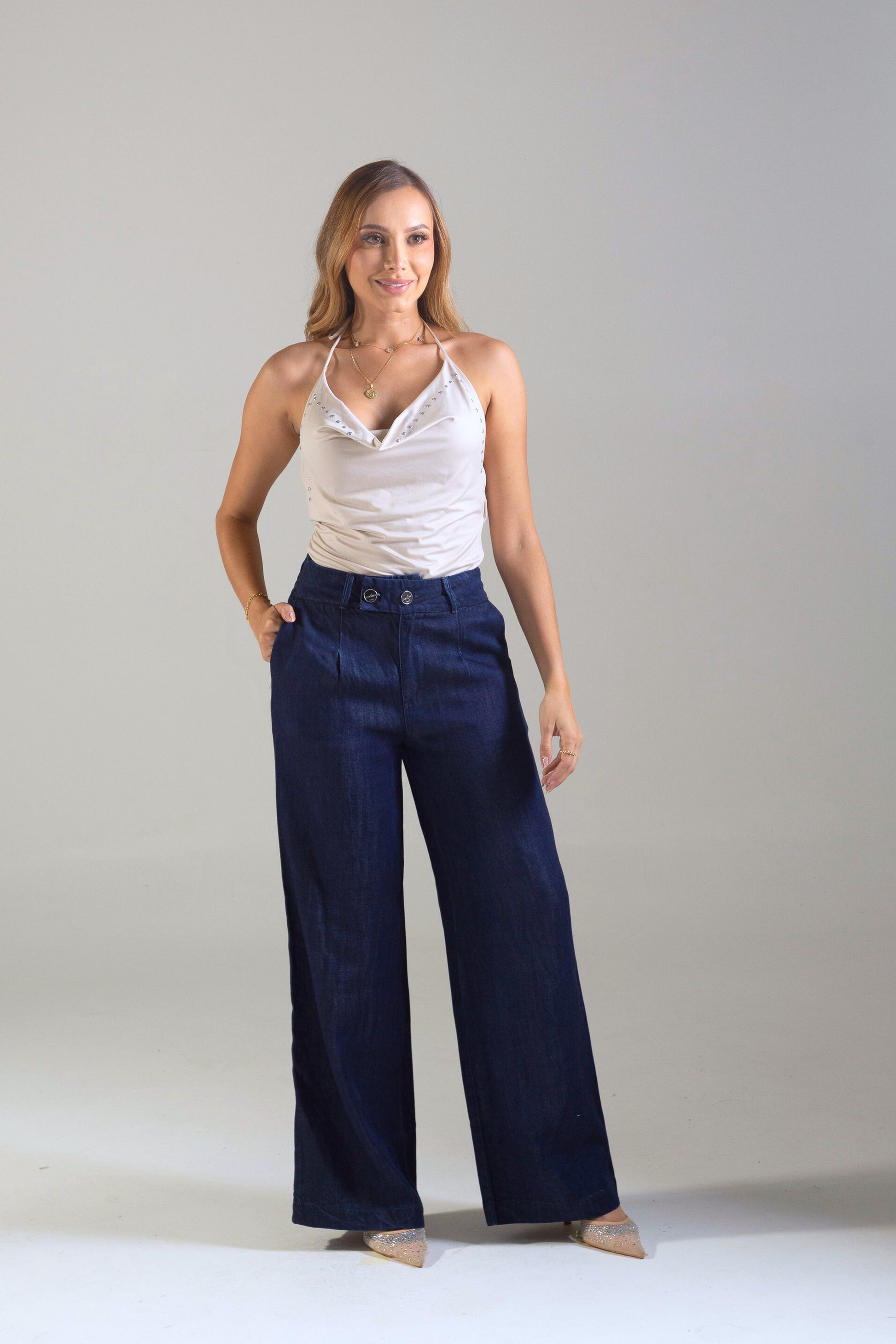 Este jean de tela rígida en tono azul oscuro combina estructura y elegancia en una silueta amplia tipo wide leg. Su diseño realza la figura con una pretina ancha de doble botón que define la cintura y da un toque moderno. La parte trasera cuenta con resorte interno que mejora el ajuste y aporta comodidad sin perder su forma. Ideal para combinar con tops, blusas o camisas por dentro, creando looks versátiles que van del día a la noche con facilidad.