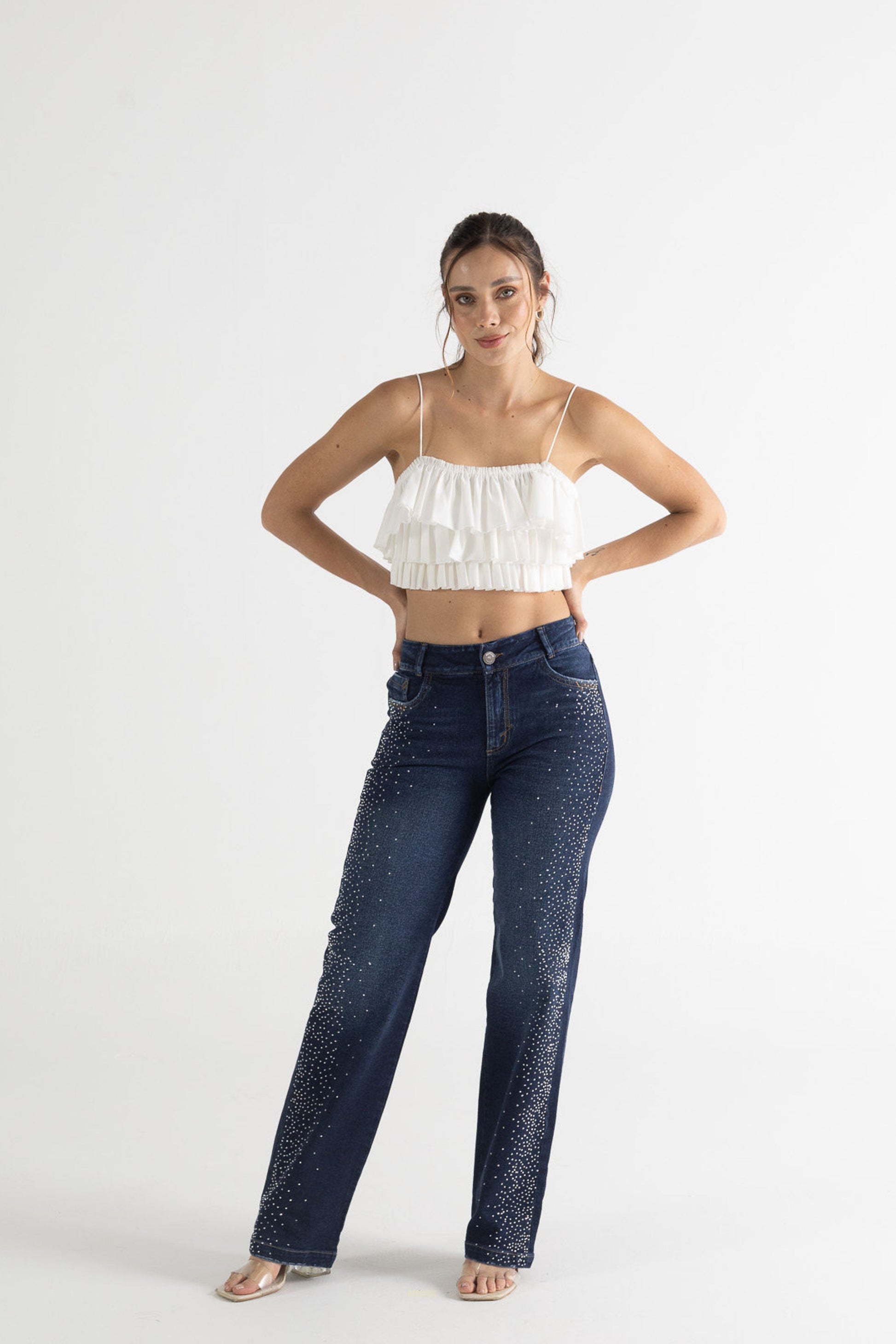 El jean bota recta que combina estilo y brillo. Su tono azul claro y el detalle de lentejuelas en la tela lo hacen ideal para quienes buscan un look moderno y femenino sin perder comodidad. Su diseño clásico estiliza la figura y se adapta a diferentes ocasiones, desde el día a día hasta una salida especial.