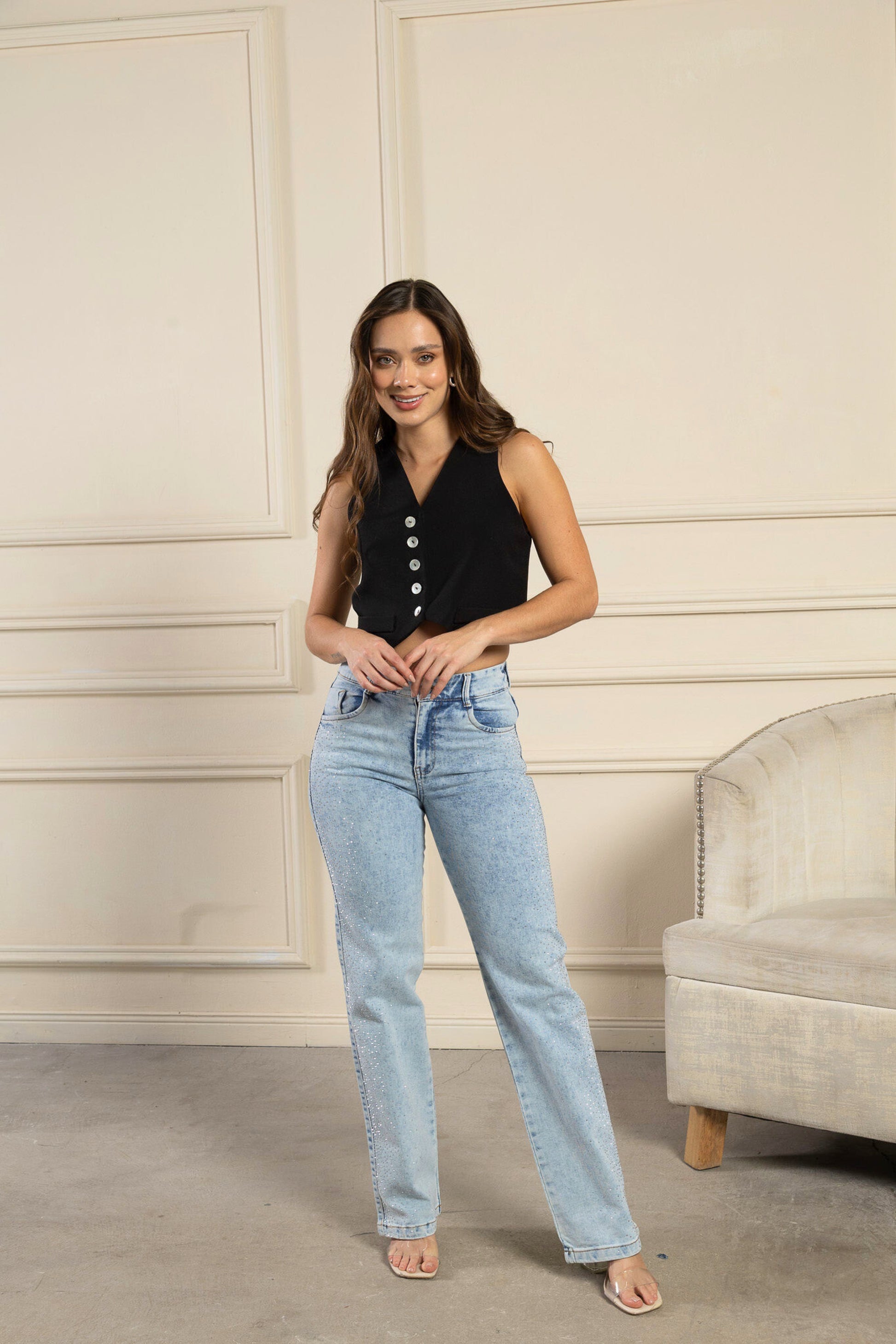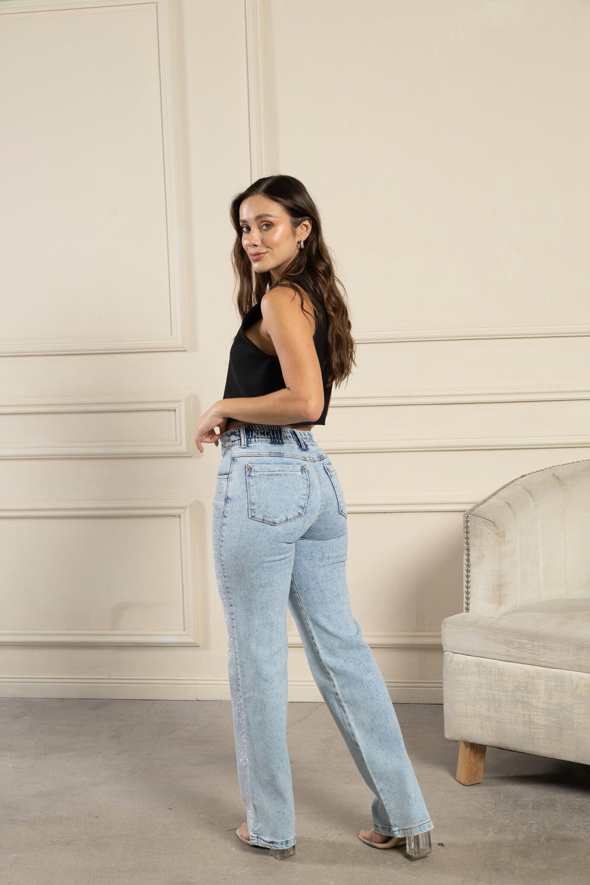 El jean que se ajusta a ti sin perder su estructura. Su pretina con resorte en la parte posterior brinda comodidad, mientras que la tela rígida mantiene su forma, realzando la silueta de manera natural. Su tono hielo, corte recto y las lentejuelas crean un look moderno en tendencia, ideal para usar con chalecos, camisas o tops ajustados.