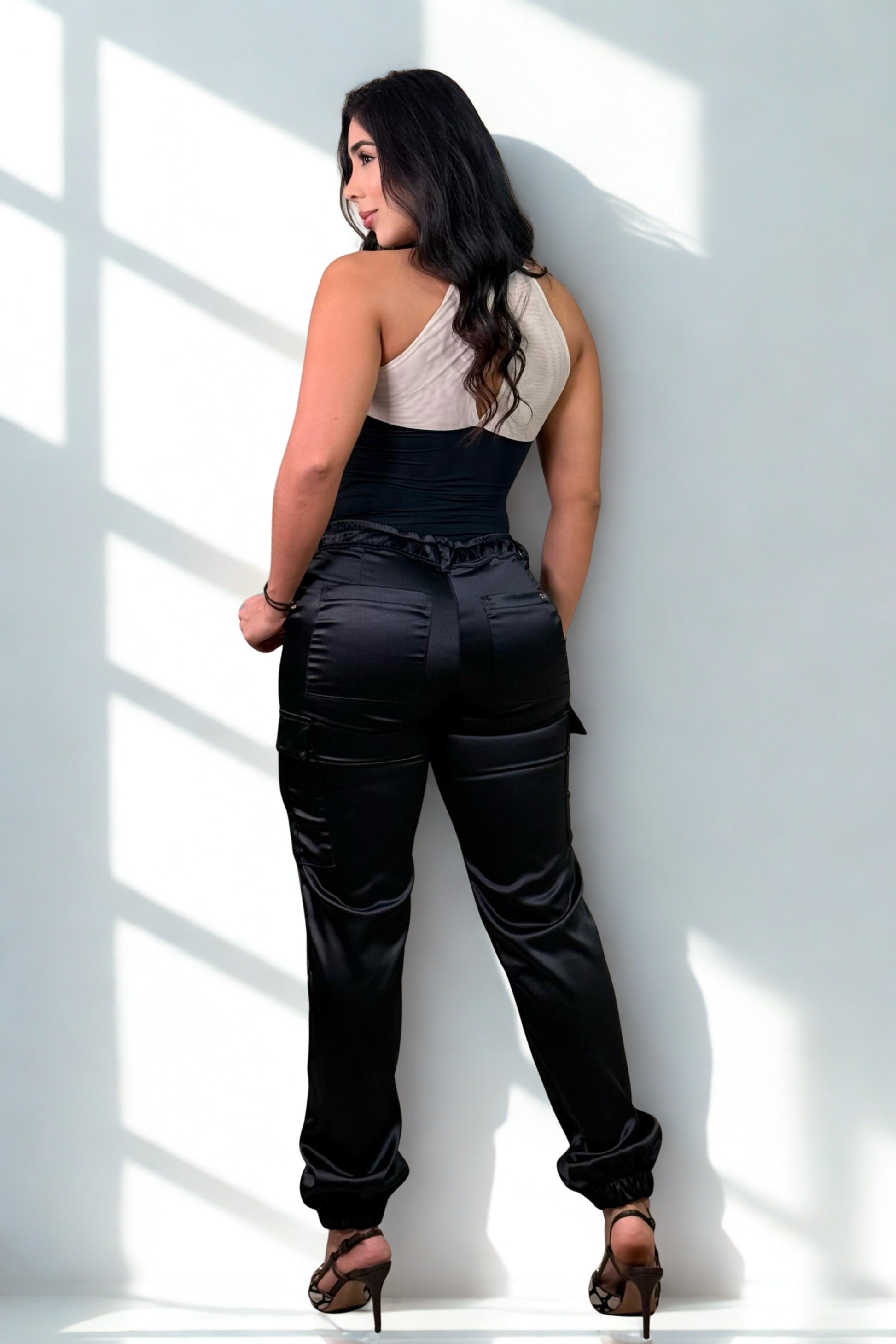 Pantalón jogger tipo cargo satinado que combina elegancia y comodidad. Su diseño moderno con bolsillos laterales tipo cargo y pretina en resorte lo hace ideal para outfits casuales o más sofisticados. El acabado satinado aporta un toque de brillo y suavidad, resaltando la silueta con un ajuste relajado y femenino. Perfecto para combinar con blusas básicas o tops estructurados.