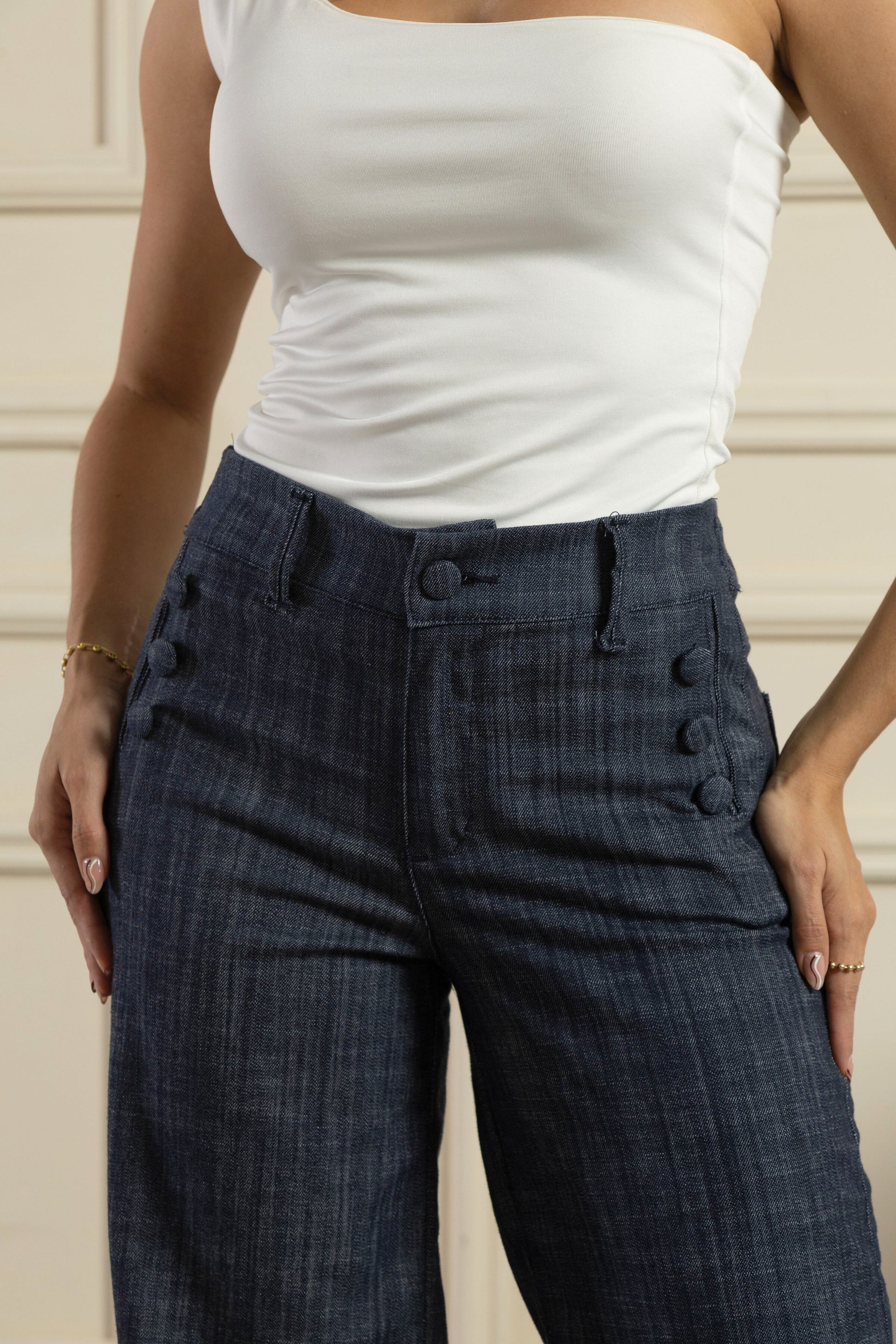 Este pantalón wide leg en tela denim de corte fluido y moderno es perfecto si buscas estilo y comodidad. Confeccionado en 100% algodón, proporciona una sensación de suavidad y frescura, ideal para todo el día. Su pretina de dos botones, combinada con su diseño de pierna ancha y botones decorativos a los lados, asegura un ajuste cómodo y resalta la figura de manera favorecedora.